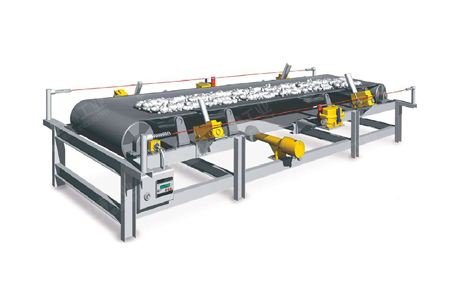防撕裂保護裝置應(yīng)安裝在皮帶落料點下方10-15m處(頭部驅(qū)動時)。安裝在輸送帶上下膠帶之間,保護方式為壓電或牽引鋼絲繩。當發(fā)生縱向撕裂時,裝置報警并終止運行。